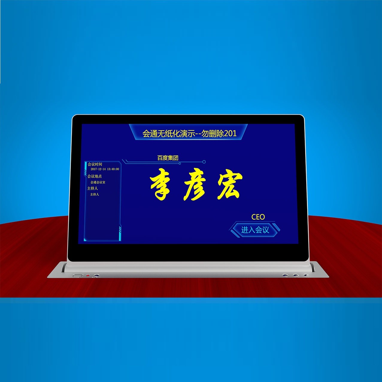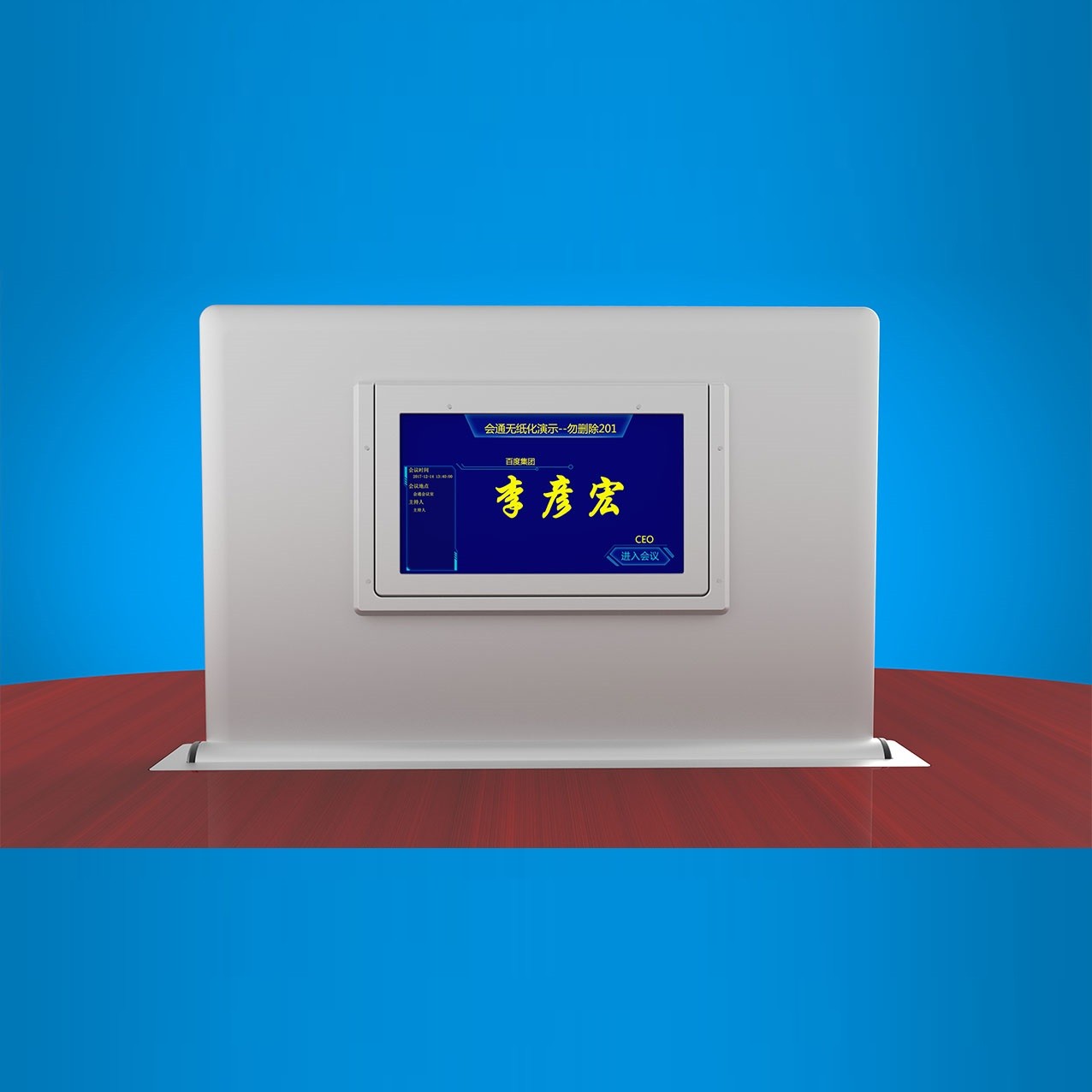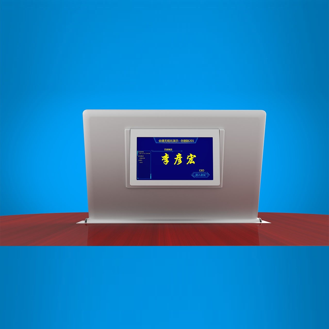 ☆4、具有铭牌显示功能、会议标语功能、会议信息功能、会议议程功能、会议议题功能:按会议进程及权限显示后台推送的会议议题,议题内文件支持word\ppt\excel等办公文件、会议签到、投票表决、交互式电子白板、信息交流功能、会议呼叫服务、接收后台软件推送的通知信息等会议功能。