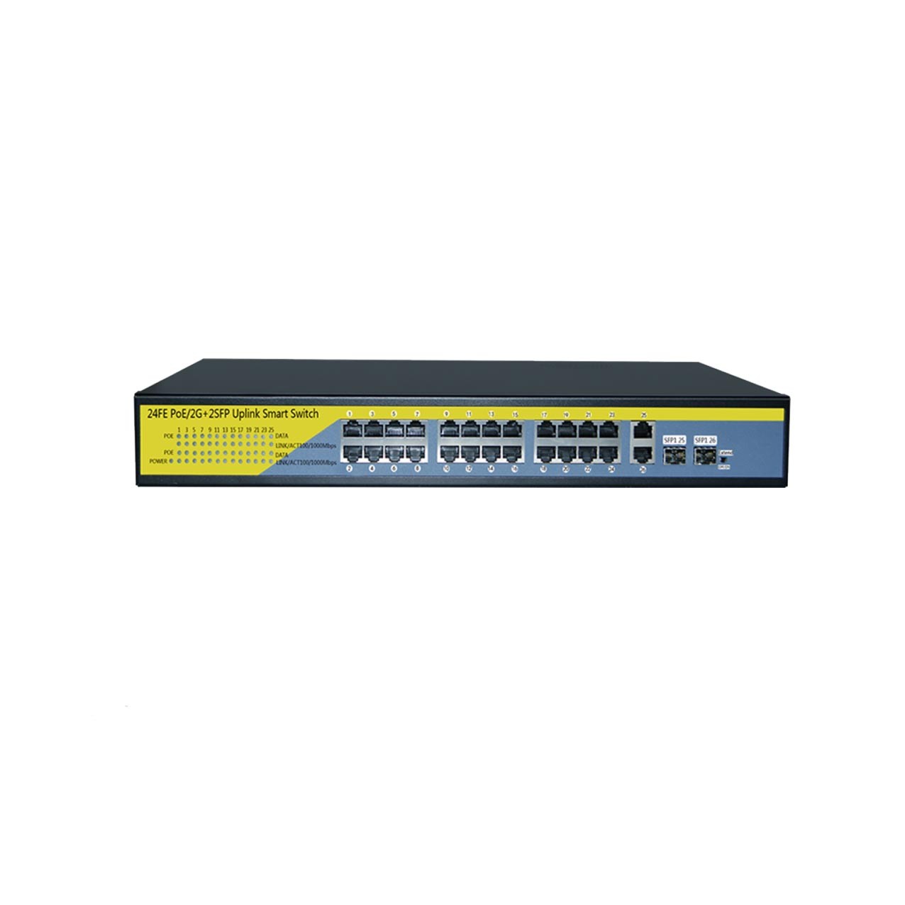 1、提供24个百兆POE高速转发数据不丢包电源数据端口,提供2个千兆SFP上联端口、提供1个AC/IN 100~240V 输入端口。